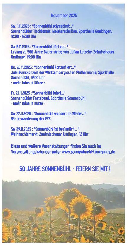 Die Kalender sind nicht nur ein wunderbares Andenken an unser Jubiläum, sondern auch ein schönes Geschenk für alle Sonnenbühl-Liebhaber und Fans! Erhältlich sind die Kalender pünktlich vor Weihnachten ab 23. November in der Tourist-Info in Undingen. Macht mit und zeigt uns, was Sonnenbühl für euch bedeutet!