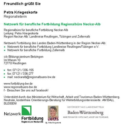 Wir – das Netzwerk für berufliche Fortbildung Landkreise Reutlingen/Tübingen e.V. in Kooperation mit der Agentur für Arbeit Reutlingen und dem Business Management Institut Reutlingen mit Unterstützung regionaler Wirtschaftsförderungen –begrüßen Sie zu unserer Veranstaltung!